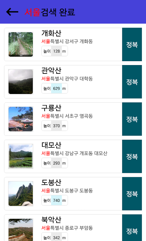 지역별 간단한 국내 산 검색 기능을 가지고 있으며 등산 매니아들에게 산들을 체크해 볼 수 있게 합니다.