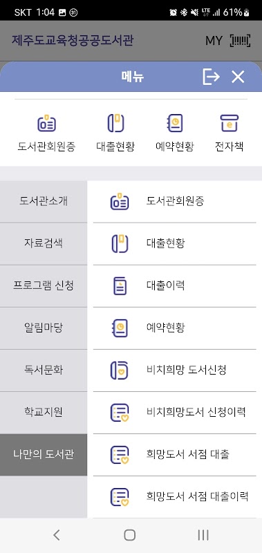它提供的功能,如公共图书馆,图书搜索和预订,贷款状态,电子书服务,图书馆信息的济州教育移动会员。
