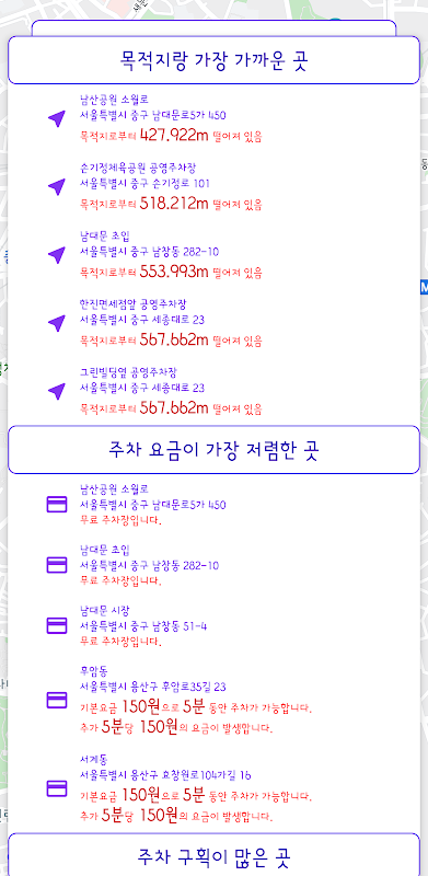 - 주차장 정보 제공(유 / 무료, 주차요금, 운영시간, 주차구획 등)
