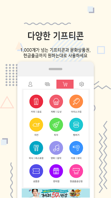 문화상품권, 온라인상품권, 온라인캐시, 해피머니, 영화예매권, 까페, 편의점, 외식상품권등 약 2,000여가지의 기프티콘 상품을 제공하고있습니다.
