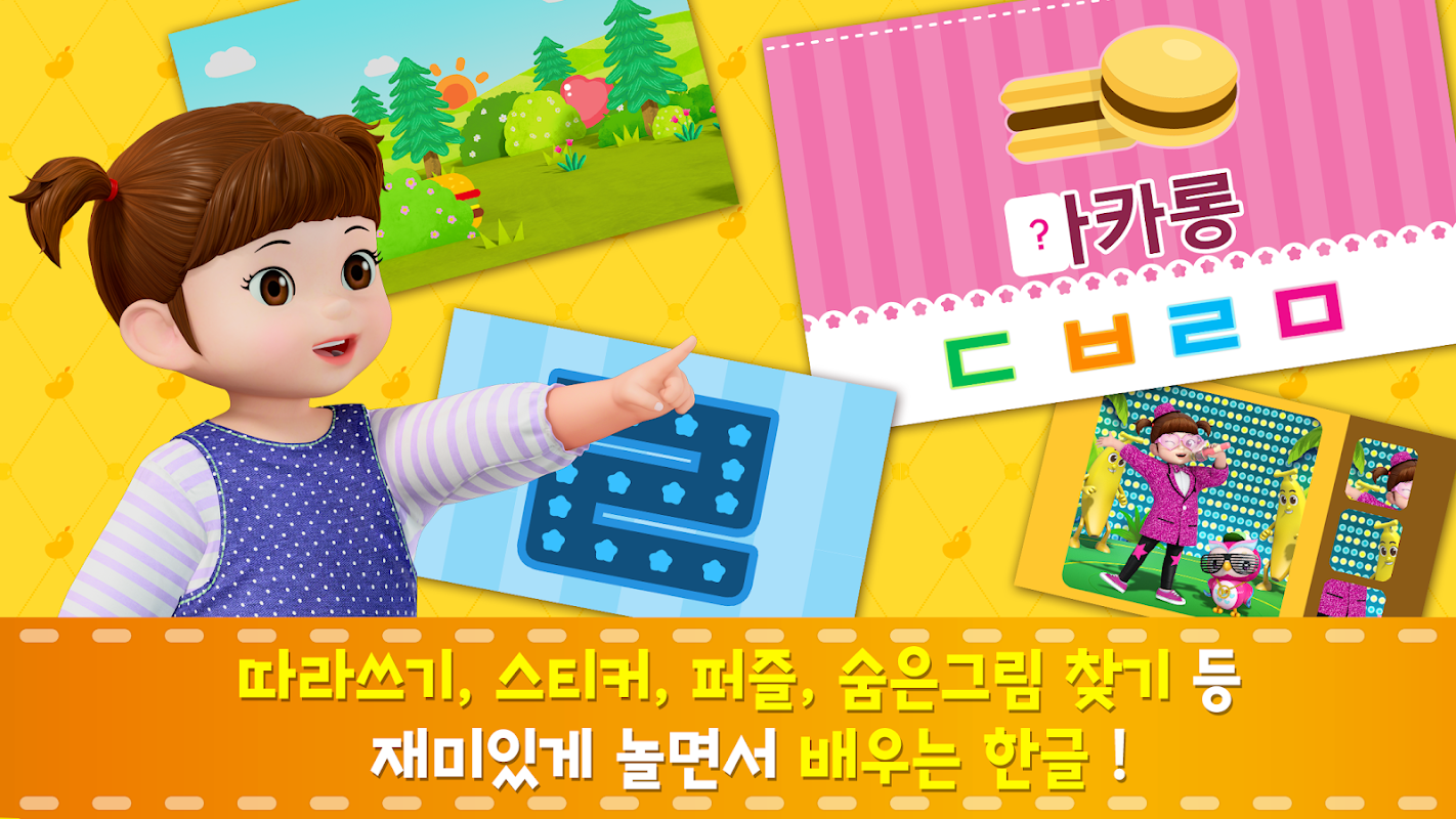 • 通过有趣的游戏(例如书写、贴纸和拼图)学习韩文