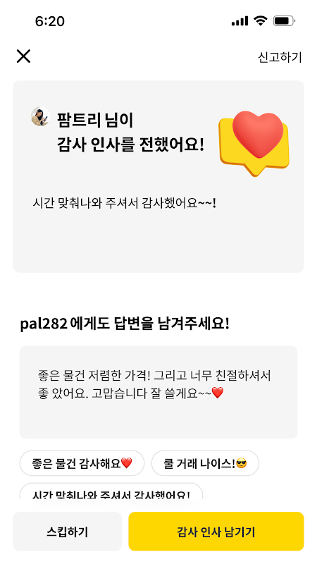 좋은 거래를 한 웃에게는 감사인사를 건네고, 문제і 생긴 거래에는 신고하는 시스템을 통해 믿을 수 있는 거래를 만듭니다。