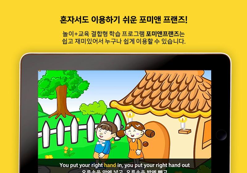 ● 포미앤프랜즈는 파닉스, 리듬에 맞춰 문장따라말하기(단문챈트, 장문챈트), 영어동요, 영어 회화, 영어동화등 무려 1,500여 편의 교육 콘텐츠로 구성되어있습니다.