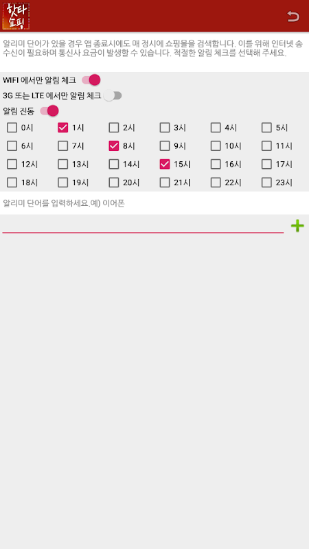 또한 원하는 상품을 알리미에 등록하면 매 정시에 핫딜, 타임딜로 올라온 상품을 검색하여 알려주는 알림 기능이 있습니다.