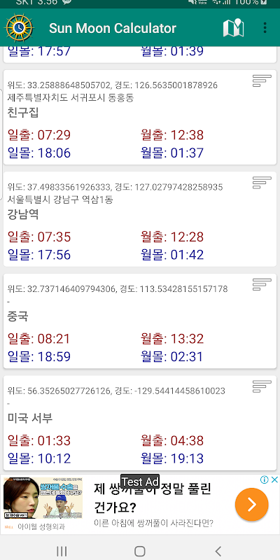 它提供了韩国所有地区的日出时间,日落时间,月出时间和月光时间。 Naver地图上没有出现的外国地区也可以使用日出,日落,月出和月出时间。