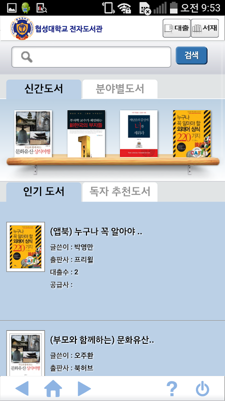 Hyupsung大学电子图书馆的贷款为会员提供电子书服务,由目标用户认证。搜索电子书,贷款和通过智能手机随时随地阅读是可能的。