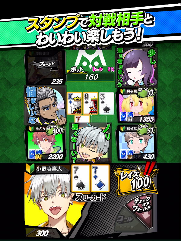 ・m HOLD'EM 的时尚设计消除了现有德州扑克游戏应用程序的形象,您可以通过著名插画家设计并由著名配音演员表演的独特头像来享受游戏。此外,您可以在享受德州扑克的同时,根据游戏过程中的情况,使用为每个角色准备的印章与其他玩家互动。