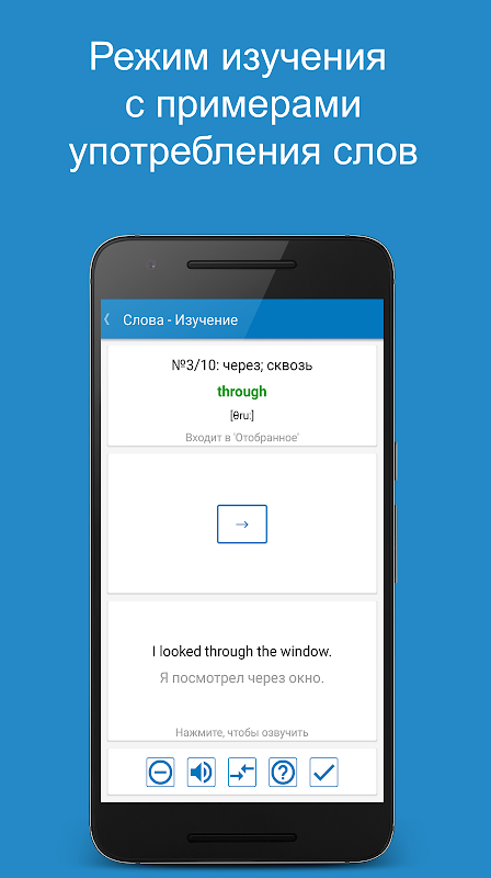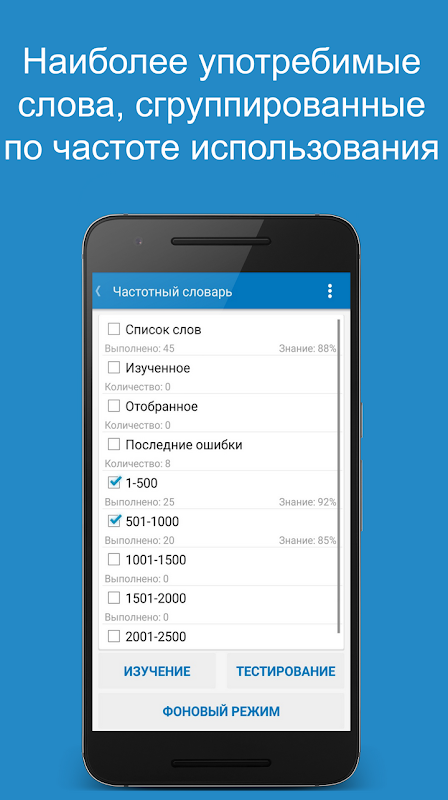 该应用程序包含数千个最常用的英语单词和使用示例,根据频率字典的原则分为500组。第一组包含最常用的单词,第二组包含最少使用的单词,等等。此外,该应用程序包括几百个典型的短语,有助于记住句子语境中的单词,掌握英语语法结构,以及最常见的习语。
