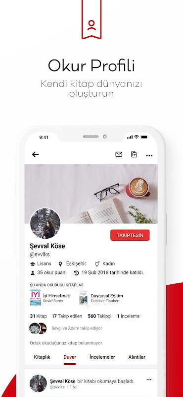 - 在图书社交网络 1000Kitap 上,您可以分享有关您阅读的图书的帖子。您可以喜欢其他人分享的帖子。这是信息量最大的社交网络。 :)