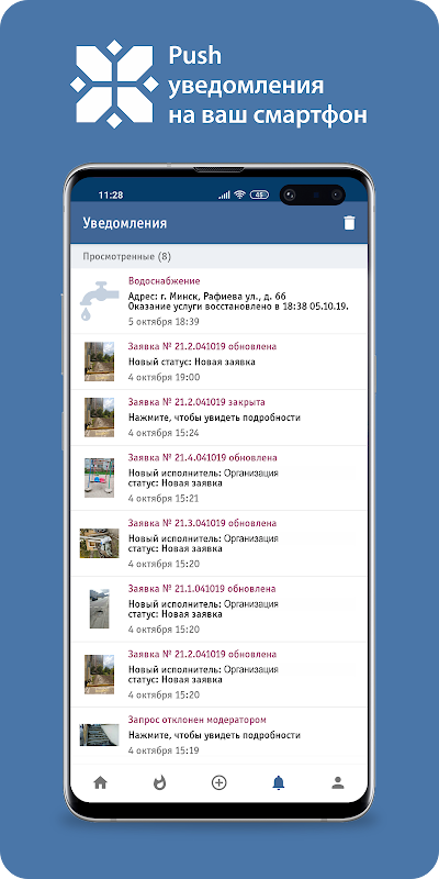 使用移动应用程序,用户有机会创建应用程序,查看先前创建的应用程序,接收有关其状态变化的推送通知,维护所选地址的列表以及接收有关缺少住房和公共服务以及这些地址处包括暖气的信息。