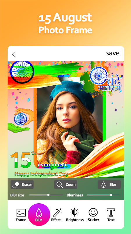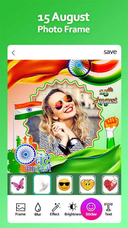 预定义相框是一款 8 月 15 日的照片编辑器应用程序,其中包含印度国旗框架、自由战士框架、