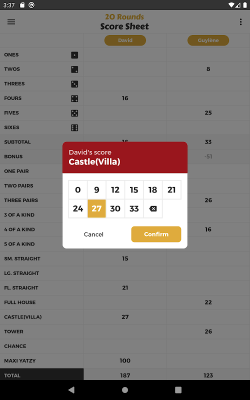 Maxi Yatzy游戏的数字评分表。不再需要笔和纸。使用自己的骰子,开始与您的朋友或家人一起玩。