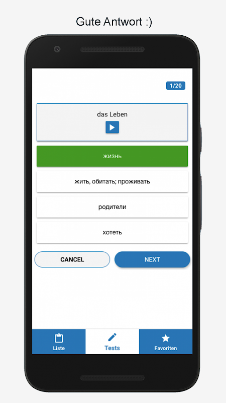 Приложение «Учите немецкий с нуля» включает в себя 200 самых часто используемых немецких слов.