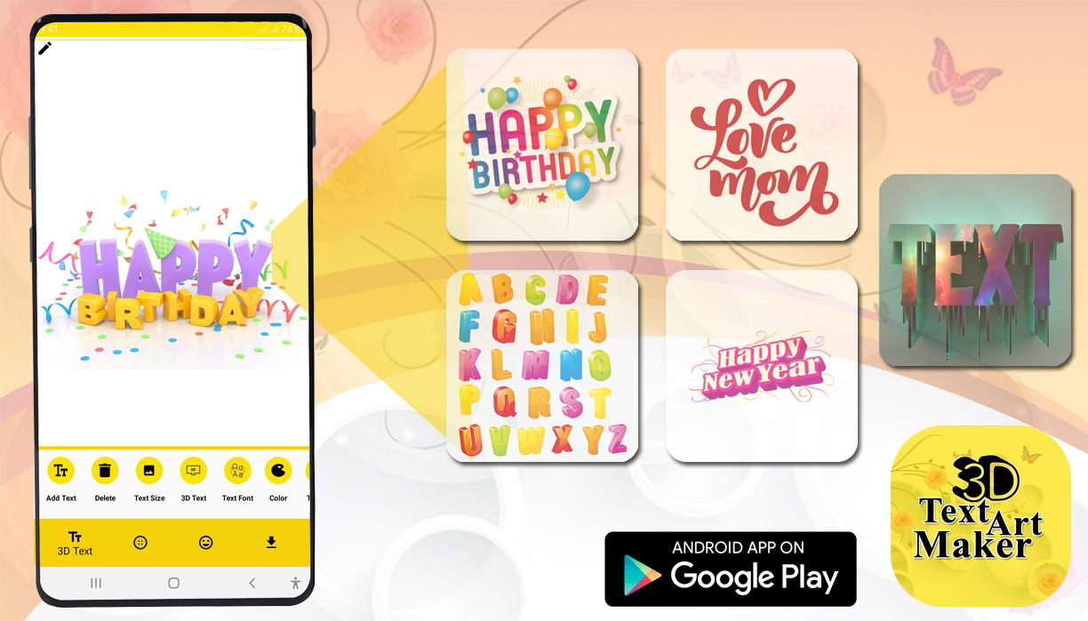 如今,将3d文字样式添加到徽标图片业务横幅,传单和名片非常重要,而没有自定义工具,很难将3d样式文字添加到您的图片中,但是我们带来了一个很好的工具,称为3d艺术maker-将3d文本添加到图片应用程序,该应用程序可让您将3d文本样式的文本添加到图片,或通过添加3d文本使图片或横幅变得时尚。该应用程序有多种选择来使文字时尚诱人。您可以使用这种漂亮的文本字体和3d样式以及不同的文本样式(例如设置文本颜色,文本模糊度,文本阴影等)创建生日贺卡,新年贺卡,贺卡。