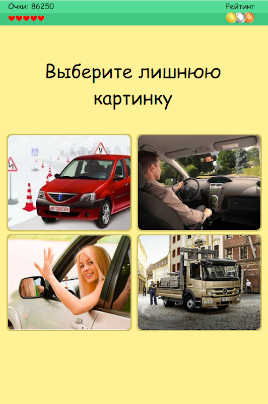 Необходимо выбрать картинку, которая выбивается из 3-х других по какому-то критерию.
