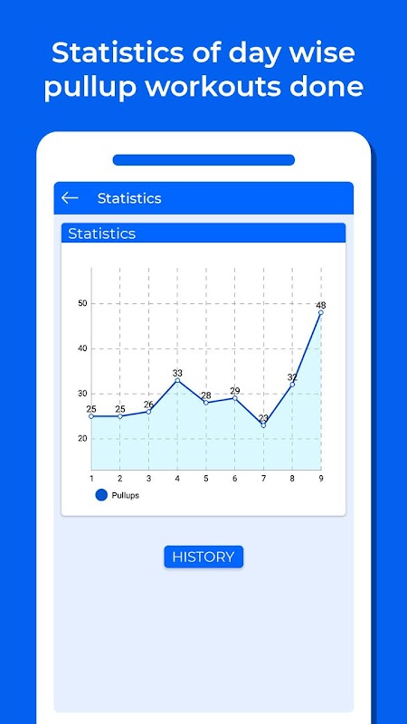 - Shows statistics and history of day wise pull-up workouts done.