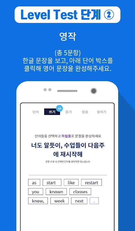 순차적인 영역별 테스트(단어, 영작, 듣기, 발음, 말하기)를 통해 단 30문제만으로 정확한 실력을 평가받아 보세요. 10,000 문제 이상의 문제 데이터와 평가 결과를 기반으로 테스트할 때 마다 새로운 문제들을 만나 실 수 있고, 정답의 여부에 따라 문제의 난이도가 달라집니다.
