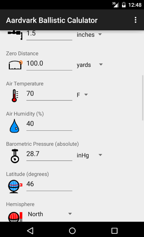 Aardvark Ballistic Calculator is very quick and easy, yet it is very advanced, giving a precise firing solution for extremely long range shooting. It starts off fast, with minimal images, for instant loading. Icons allow you to find what you need to change in a hurry, without reading every heading. The program is precise at extremely long range, as an example; the latitude is taken into account when calculating gravity. Advanced calculations include Spin Drift, Vertical and Horizontal Coriolis effect.