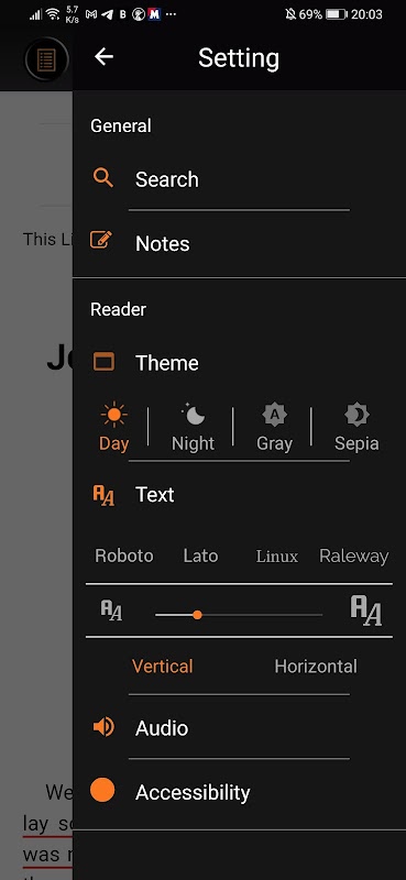 - Day and Night mode: Choose between 4 themes (Day, Night, Sepia, Grey)