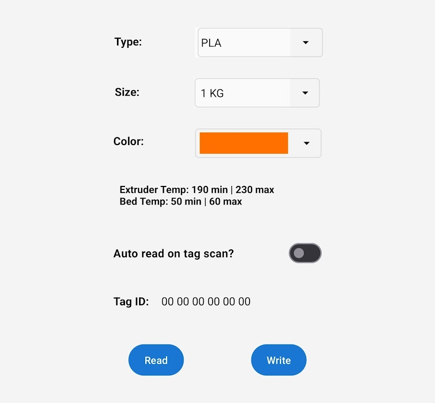 简单的开源应用程序,用于对 MiFare Ultralight 或 NTAG213 RFID 标签进行编程,以识别支持 Anycubic ACE 的 3D 打印机上使用的灯丝类型。