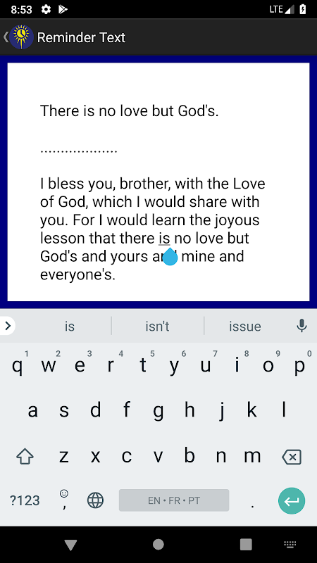 - 内置可自定义的提醒提醒:提醒内容完全可自定义,并预设了当天需要记住的具体内容以及《奇迹课程》建议的提醒间隔。您可以选择提醒的开始和结束时间、间隔和声音。