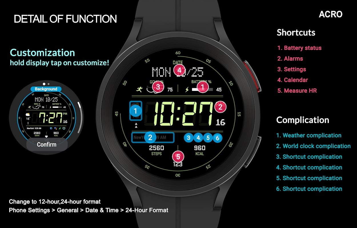 1. 按住表盘 > 2. 单击装饰按钮 > 3. 点击每个复杂功能区域以设置相应的信息 > 4. 单击确定