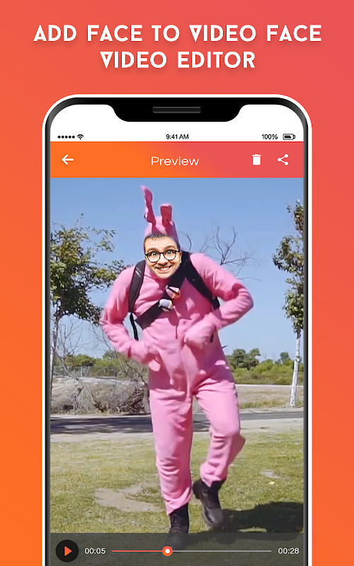 Share funny faces video clip using this Add Face To Video - Face Video Editor app. This is an amazing way to add anyone faces into funny video clip through our awesome Face to Video Editor app. App which has an amazing collection of funny video clip. Place your face into a funny video clip with free finger rotation, Easy to cut and edit face into funny video clip.