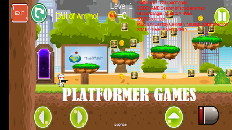 全新上瘾的平台游戏《猫突击队》射击和跳跃冒险游戏,具有不同的技能水平,可以收集硬币,弹药和老板打架。