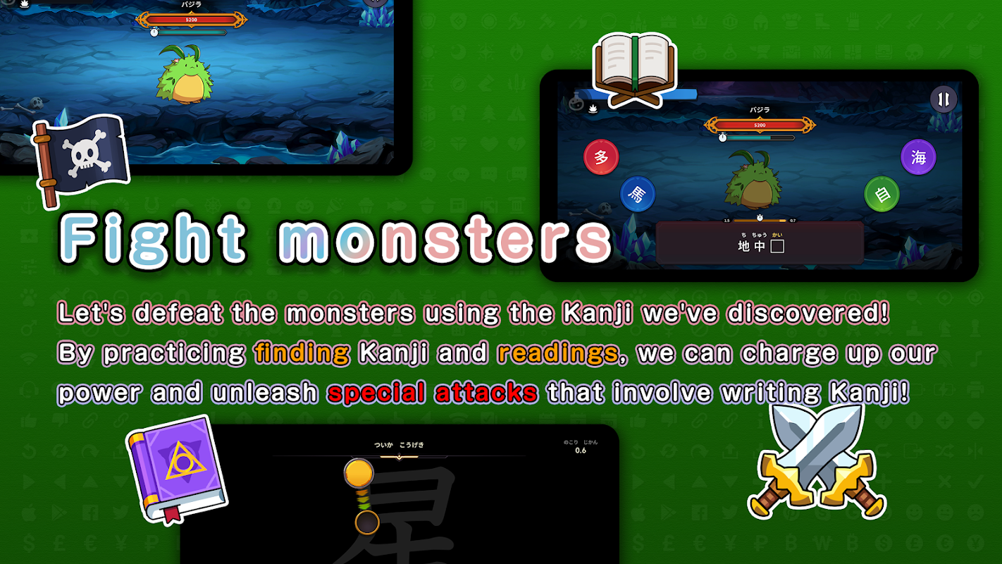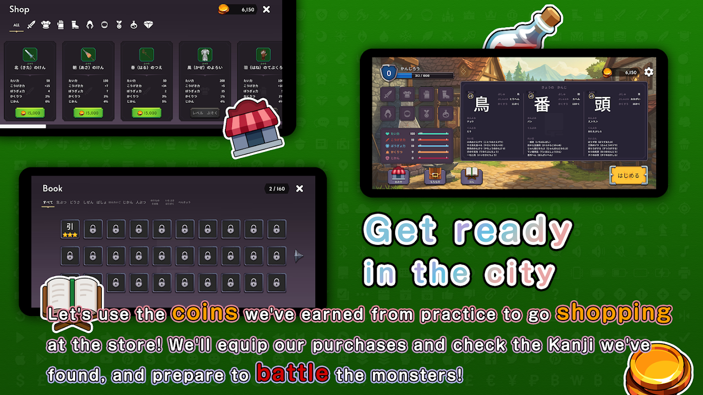您可以在商店使用这些硬币购买装备和药水,为与怪物的战斗做好准备。在这些战斗中,你越快回忆起发现的汉字,你就能造成更大的伤害。然而,如果你的记忆不正确,你反而会受到伤害。此外,必杀技“写攻击”涉及按顺序追踪汉字笔顺,让您在演奏时自然地学习正确的笔顺。打败怪物不仅取决于好的物品,还取决于你对汉字的记忆程度。