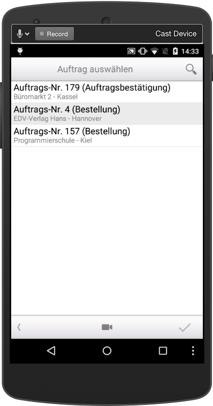 Zur Kommissionierung freigegebene Vorgänge können geholt und die entsprechenden Artikel abgescannt werden. Falsch gescannte Artikel, welche nicht zum Vorgang gehören, werden entsprechend mit einer Warnmeldung verworfen.