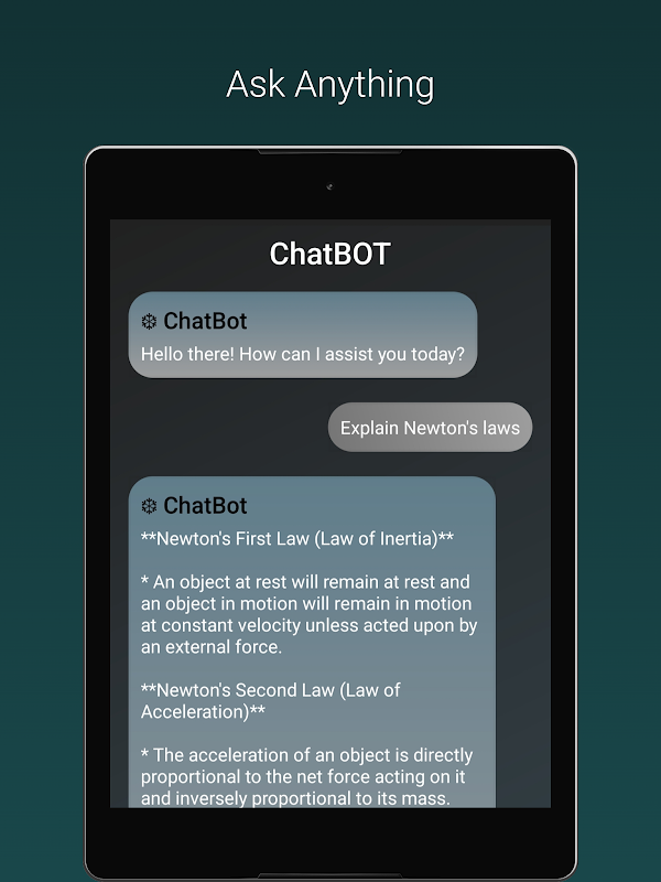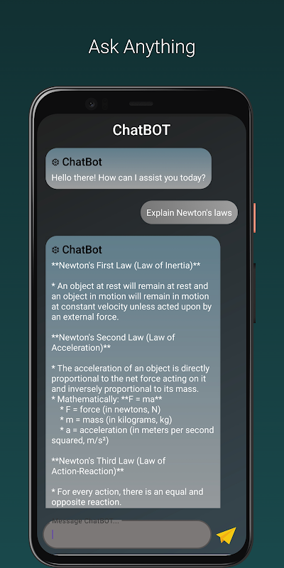 This is an AI chat app that will answer any question you have. By using the latest AI technology, it is possible to appropriately answer user questions.