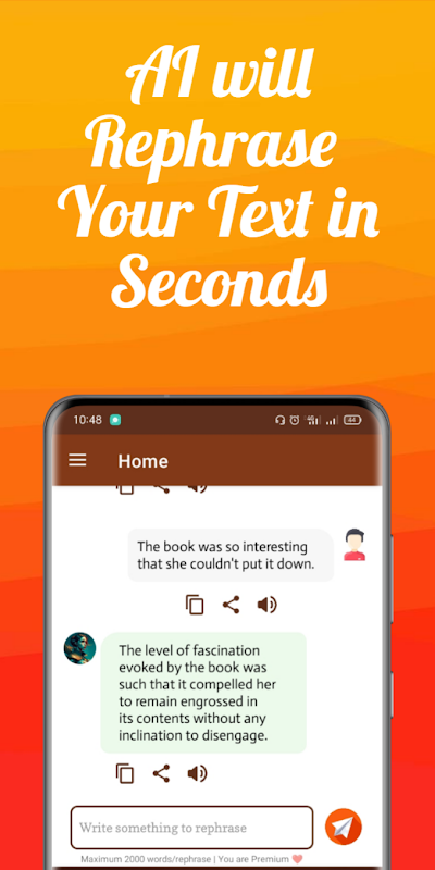 使用 AI Rephrase,您可以节省时间和精力,同时提高您的写作技巧并增强您的内容。无论您需要改写文章、报告、电子邮件还是任何其他类型的文本,AI Rephrase 都是可以帮助您实现目标的应用程序。立即下载,看看有什么不同!