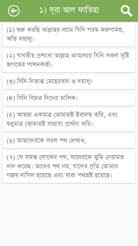在这种应用中,古兰经的所有古兰经(114)孟加拉语的钱已被添加。每章一直ayatabhittika孟加拉钱。直接从列表中会出现选择苏拉特的任何诗句的含义孟加拉语。