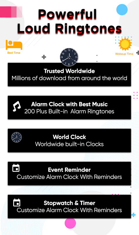 鬧鐘在這裡準時並設置提醒與喚醒鬧鐘音樂以獲得一些警報效果。這個鬧鐘 - 喚醒鬧鐘具有世界時鐘的可行性,可用於設置鬧鐘音樂和鬧鐘鈴聲。帶有時尚模擬時鐘和鬧鐘音樂的響亮鬧鐘在這里為您提供在手機屏幕上設置的鬧鐘壁紙。這個鬧鐘 - 喚醒鬧鐘應用程序包含響亮的鬧鐘。鬧鐘在這裡帶有內置音樂和壁紙,可在鬧鐘應用程序中享受顯示時鐘。世界時鐘查看世界任何地區的當前時間。使用午餐和晚餐鬧鐘為事件或祈禱時間設置睡眠鬧鐘提醒,讓您的生活有規律。睡眠中的睡眠喚醒警報將有助於讓您及時了解您的日常生活。