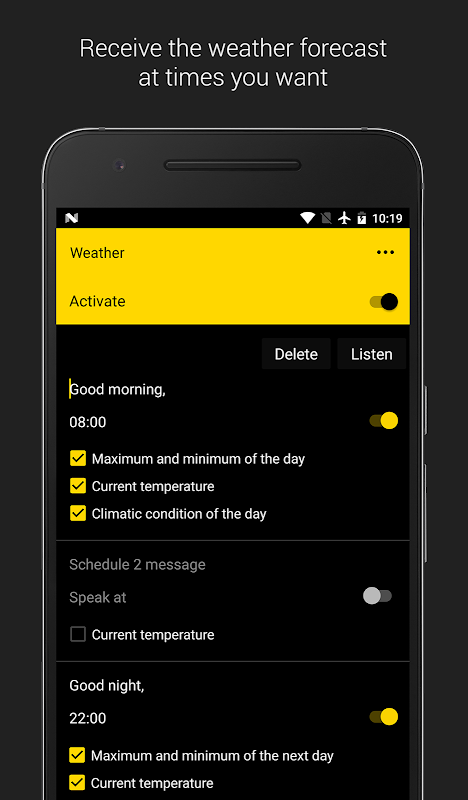 该应用还在期望的时间提供天气预报(来自OpenWeatherMap数据)的警报。