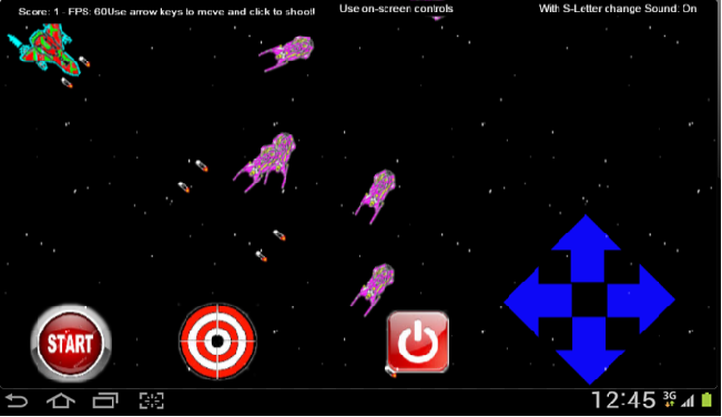 Game works with touch screen or keyboards. With s-key you get fighting, laser and explosion voice away.