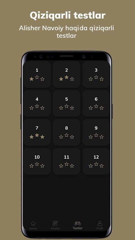 • 📝 Ijodi va hayoti bo'yicha bosqichli testlar — yulduzlar orqali natijani baholash