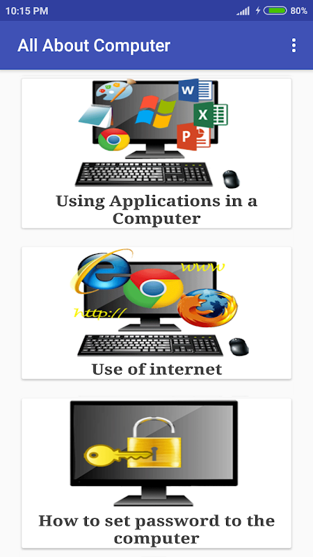 所有关于电脑的应用程序将帮助你提高你的电脑知识。使用这个程序,你将能够学习如何使用电脑。这个程序包括有关电脑操作的基本信息。此外,在这种应用各种电脑配件相关信息包括在内。