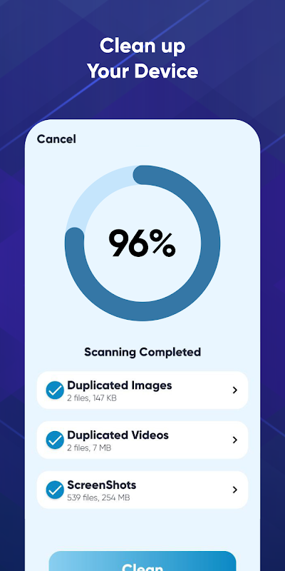 **清理**:AllCarePro 的清理功能可识别设备上的重复图像和视频。只需点击一下即可开始清理过程,AllCarePro 将删除重复项,同时保留每个文件的一份副本。