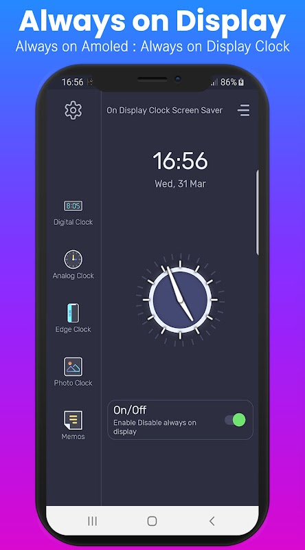 Always on Display or Clock Screen Saver is a super app that display basic information like Mobile Time, Date, Notification on black screen when your mobile Screen is "Off".