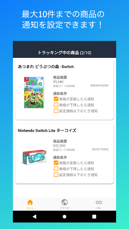 本アプリではAmazonで販売される商品の価格を監視し、値段の変化を通知します。