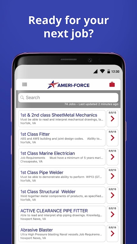 与Ameri-Force应用保持联系。在旅途中搜索,查看和申请工作。当作业与您的关键字匹配时接收作业提醒无论您身在何处,Ameri-Force应用程序都能让您保持在循环中。