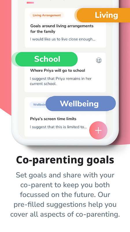 设定私人目标并与你的前伴侣分享目标,让你们都专注于未来,并能够管理彼此的共同育儿期望。使用有关最常见育儿主题的预先填写的建议,或根据您的家庭设置创建您自己的定制目标。