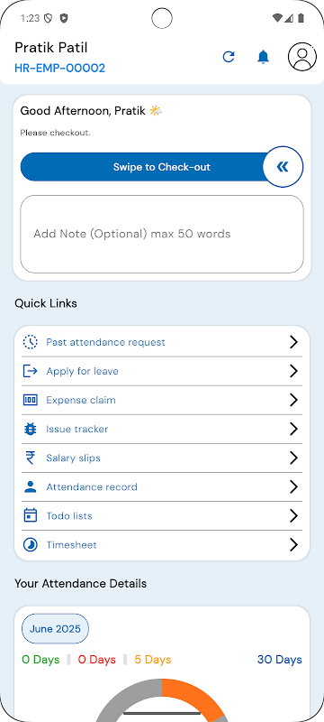 考勤追踪:轻松追踪员工出勤情况。员工只需轻点即可签到和签退,管理人员可以实时监控出勤情况。