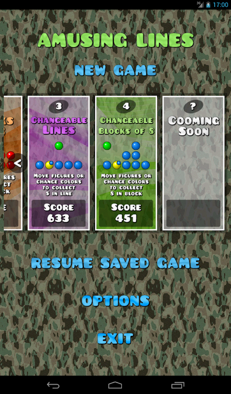 Amusing Lines is a logical puzzle game with original idea to change colors of figures. The goal is to get as much points as you can, cleaning figures from table. It contains 5 different games:
