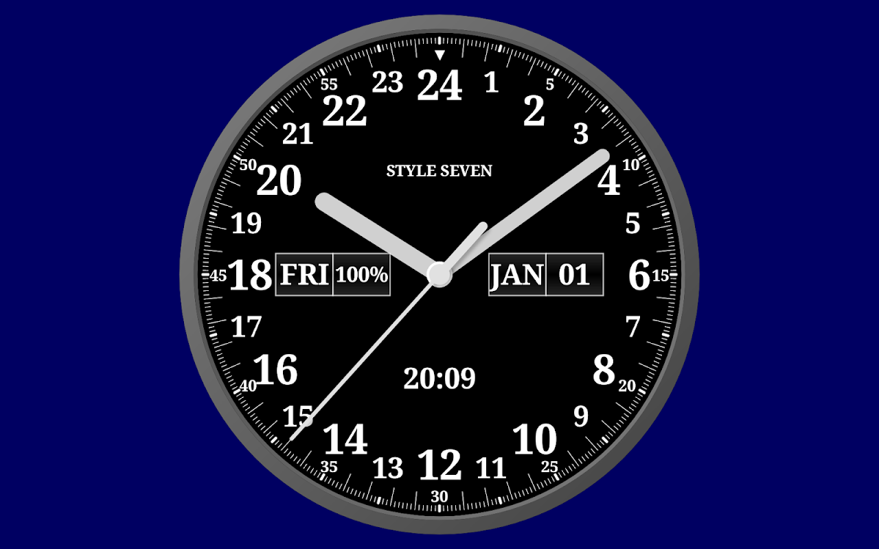 模拟时钟,可选择 12 小时制或 24 小时制。24 小时制模式下,时针一天旋转 360 度。您也可以通过设置将其切换为经典的 12 小时制模拟时钟。