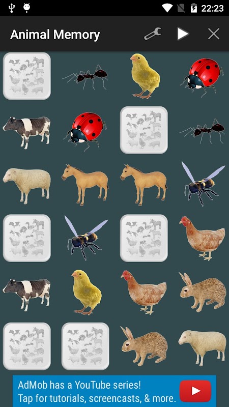 这款游戏包含三组动物图片:野生动物、农场动物和海洋动物。目标是用尽可能少的步数匹配图片,打破高分记录。