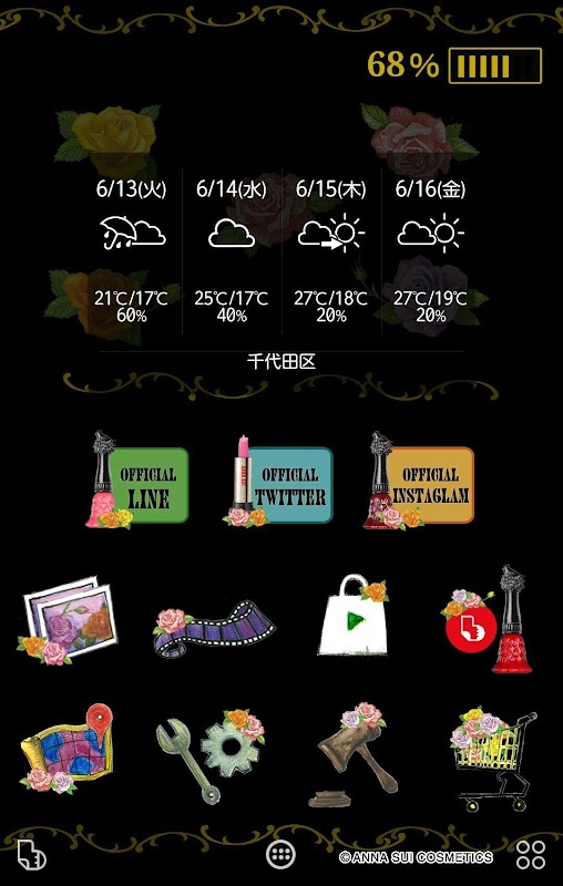 かわいいのにどこか懐かしいANNA SUIの世界観がホーム画面いっぱいに広がります。