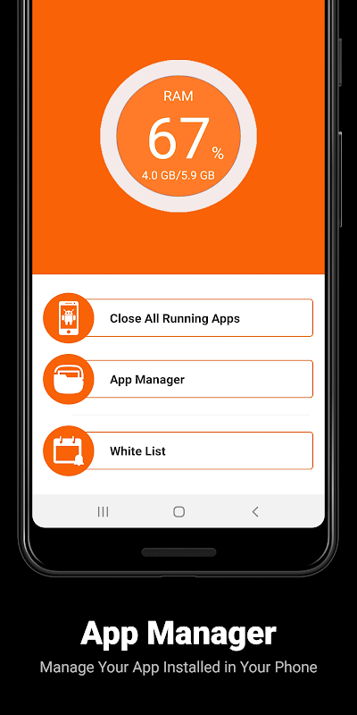 By Closing all running apps or app manager, The App can help you speed up your phone, save more battery power and extend your battery life. Killing useless running apps can also reduce CPU usage and cool the CPU down.