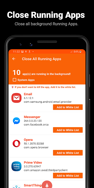 If you don't want to kill some apps, you can add them to the white list. The apps in the while list won't be closed.